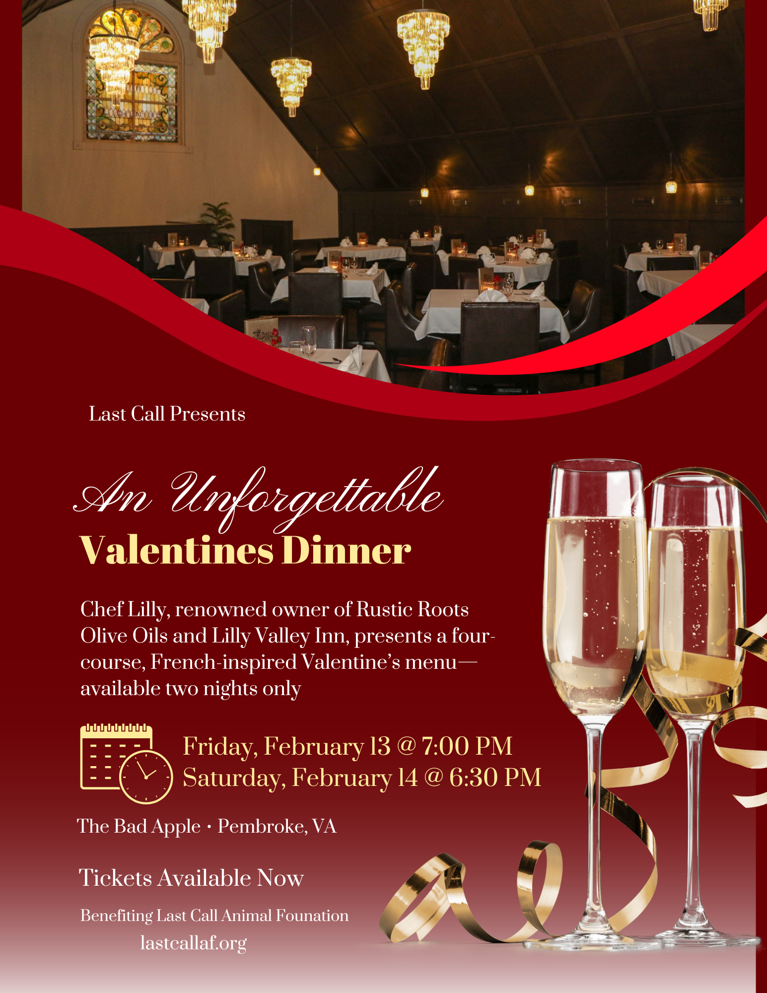 An evening meant to sip, savor and linger. Two nights, four courses, one incredible guest chef. Chef Lilly of Rustic Roots Olive Oils and Lilly Valley Inn guest chefs at The Bad Apple this Valentine's - optional wine pairing (Altillo Vineyards), cocktails and a VIP photo experience are all available. Tickets go on sale January 13!